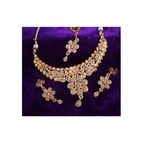 Golden Alloy Necklace Set With Earrings and Maang Tikka 257306